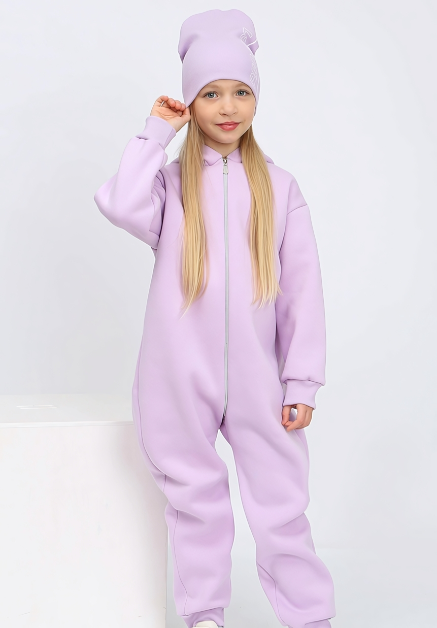 Размер: рост 110 см, подходит для девочек от 2,5 до 3 лет. Цвет: нежный сиреневый, универсальный и легко сочетается с любой обувью и аксессуарами. В комплекте — комбинезон и шапка того же оттенка.