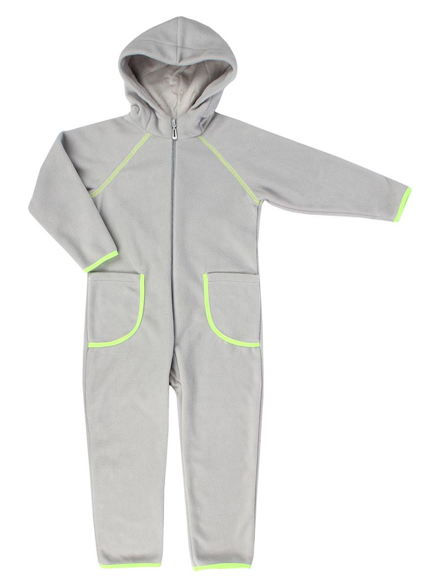 Комбинезон представлен в светло-сером цвете с яркими зелеными вставками. Он доступен в размере 98, что подходит для детей в возрасте около 2-3 лет. Состав ткани: 100% полиэстер, что гарантирует его прочность и износостойкость.