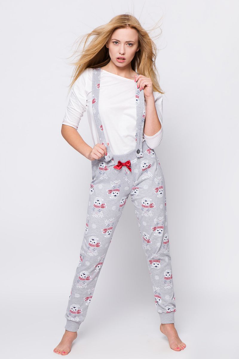 Комбинезон домашний с кофтой, серый с белым, принт совы, размер M, 100% хлопок