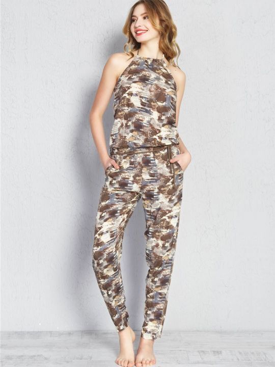 Комбинезон представлен в коричневом цвете с абстрактным рисунком, включающим оттенки бежевого и белого. Зауженные к низу брючины делают силуэт более аккуратным. Для сохранения качества изделия рекомендуется бережная стирка согласно инструкции на ярлыке.