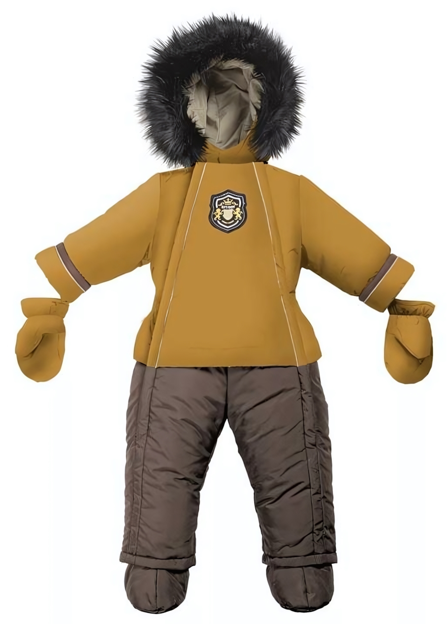 Этот утепленный комбинезон станет надежным защитником вашего ребенка в холодную погоду. Изготовленный из 100% хлопка, он обеспечивает отличную воздухопроницаемость и комфорт при носке. Яркий горчичный верх в сочетании с темно-коричневым низом придаст вашему малышу стильный вид, а капюшон с опушкой добавит практичности.