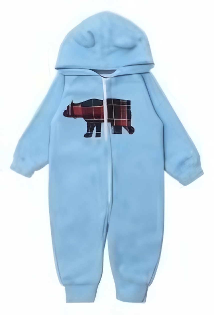 - Оригинальный дизайн: Светло-голубой цвет с принтом медведя в клетку делает комбинезон стильным и привлекательным.