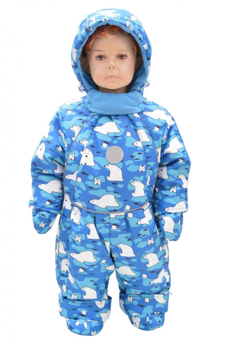 Размер – 80 см (по росту ребёнка). Цвет – насыщенный синий с яркими рисунками белых медведей и снежинок, привлекающими детское внимание. Все швы укреплены, а манжеты на рукавах и ногах заужены для лучшей изоляции.