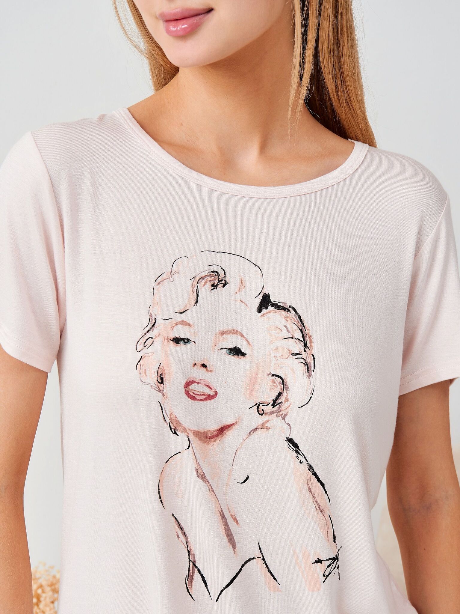 Пижамный комплект из вискозы с эксклюзивным принтом Marilyn Monroe — это воплощение комфорта и элегантности. Нежный пудровый оттенок в сочетании с воздушной тканью создаёт ощущение уюта, а эластичный материал идеально адаптируется к вашему телу.