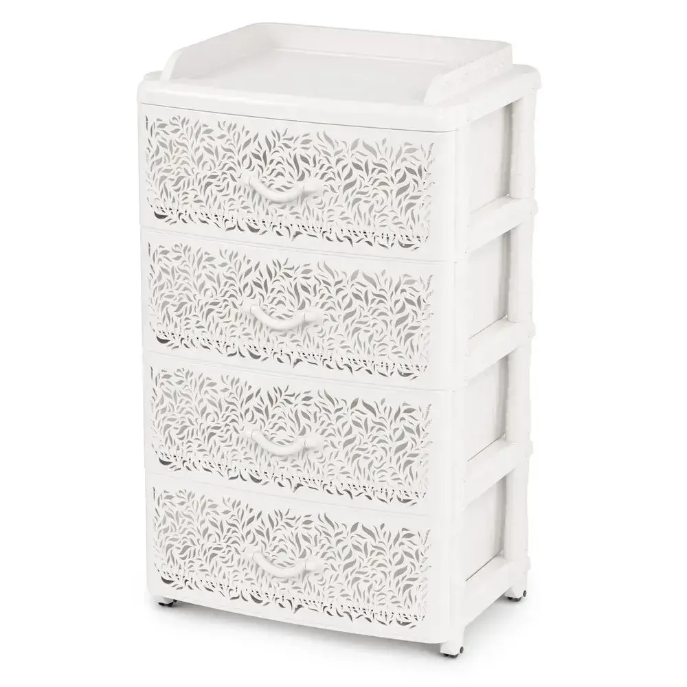 Пластиковый комод 'Аура' станет незаменимым помощником в организации пространства. Четыре вместительных ящика с элегантным растительным узором помогут разложить вещи по категориям и всегда поддерживать порядок.