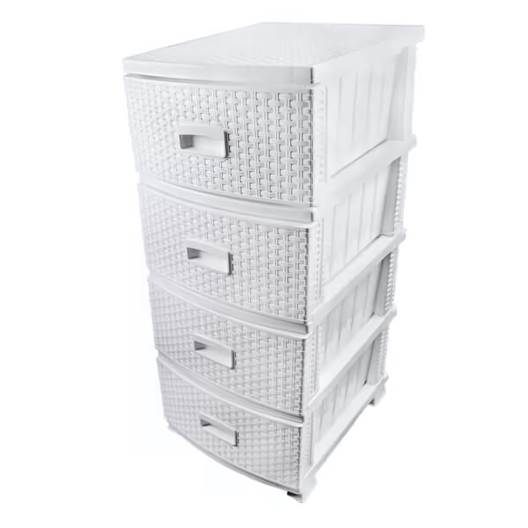 Комод ДЕКОР 4-х РОТАНГ в белом цвете — это стильный и практичный элемент мебели, который поможет вам организовать пространство и сохранить порядок в вашем доме. Его компактные размеры и легкая конструкция делают его идеальным для использования в ванной, спальне или кладовой. Благодаря четырем выдвижным ящикам, вы сможете удобно хранить различные вещи, от косметики до текстиля.