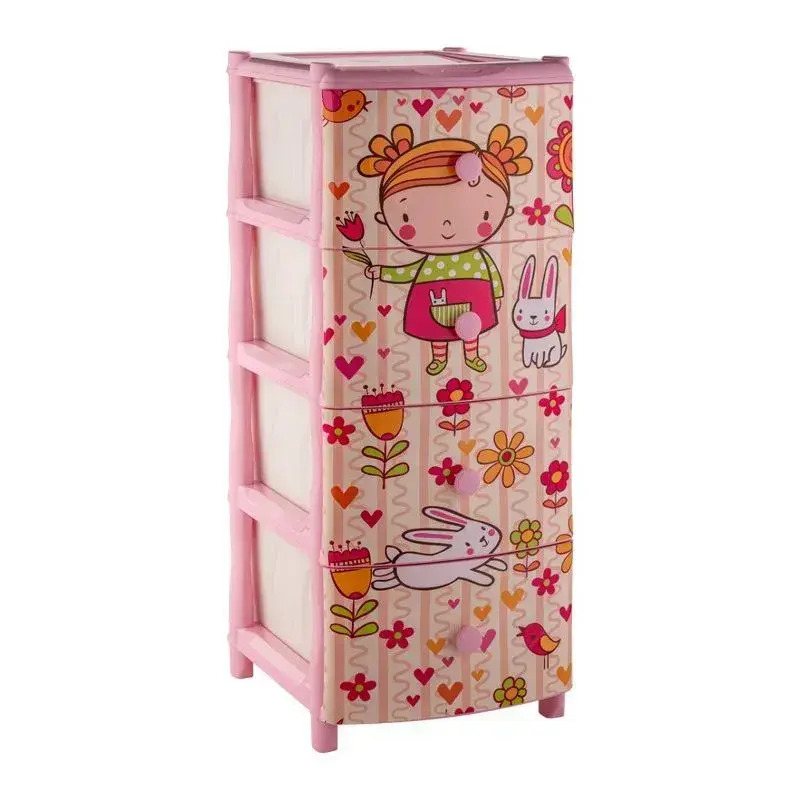 Пластиковый комод 'Девочка с рисунком' создан специально для детских комнат. Его яркий дизайн с изображением милой девочки и забавных животных привлечет внимание ребенка и научит его порядку.