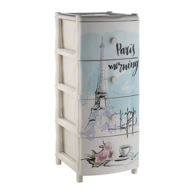 Узкий комод с романтичным дизайном станет изюминкой вашего интерьера. Рисунок с Эйфелевой башней и надписью 'Paris morning' создаёт уютную атмосферу, а компактные размеры позволяют разместить мебель даже в небольших помещениях.