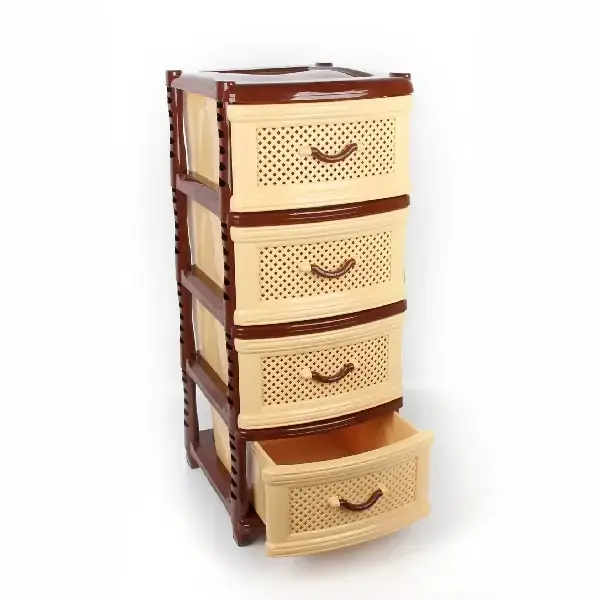 Комод имеет вертикальную форму и состоит из четырех выдвижных ящиков, которые открываются фронтально. Это позволяет вам легко находить нужные вещи, не тратя время на поиски. Ящики комода выполнены из прочного пластика, что гарантирует долговечность и надежность. Благодаря перфорированной поверхности ящиков, воздух свободно циркулирует, предотвращая накопление запахов.