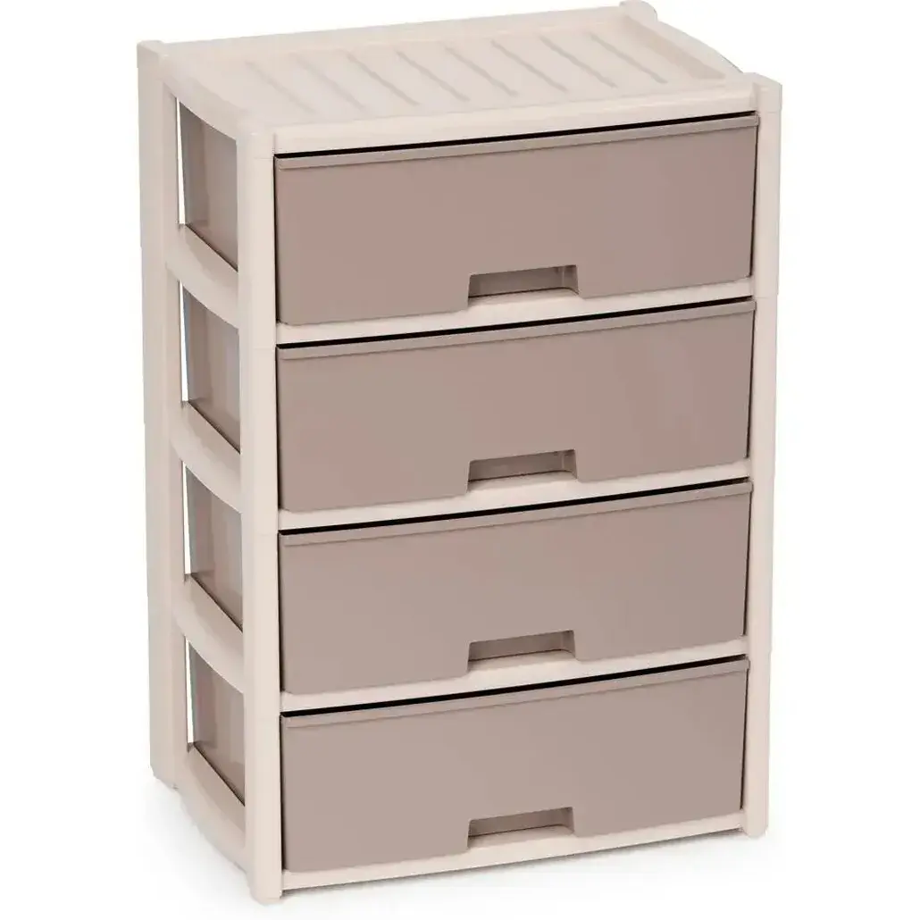 Пластиковый комод с четырьмя вместительными ящиками — решение для хранения мелочей в ванной, прихожей или детской. Эргономичная конструкция и нейтральная гамма в бежево-коричневых тонах впишутся в любой интерьер.