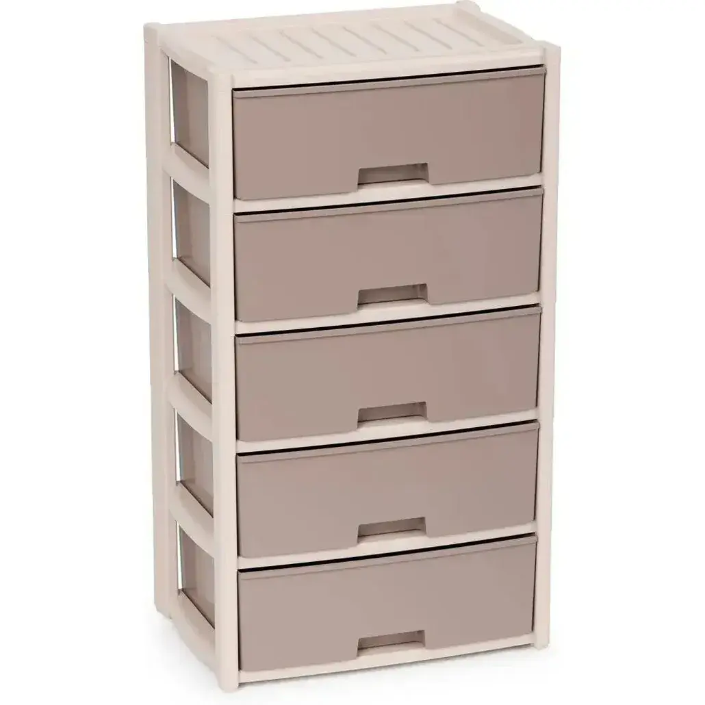 Пластиковый комод 'Колорит' станет идеальным решением для организации пространства. Благодаря пяти вместительным секциям вы сможете аккуратно разместить одежду, белье или другие необходимые вещи.