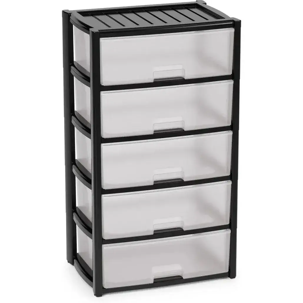 Пятисекционный пластиковый комод с прозрачными ящиками — идеальное решение для систематизации мелочей. Чёрный каркас в сочетании с прозрачными контейнерами создаёт стильный акцент в интерьере, а вертикальная конструкция экономит место даже в небольших помещениях.