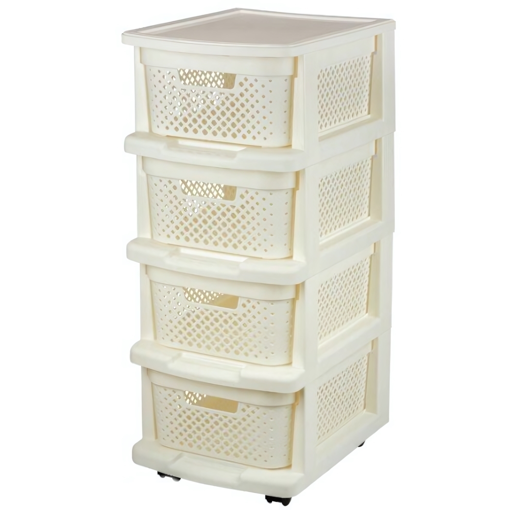 Комод оснащен колесиками, что позволяет легко перемещать его по комнате. Это особенно удобно, если вы хотите изменить обстановку или просто убрать его в другое место. Прямоугольная форма и перфорированные ящики обеспечивают видимость содержимого и хорошую вентиляцию, что делает его идеальным для хранения различных предметов.