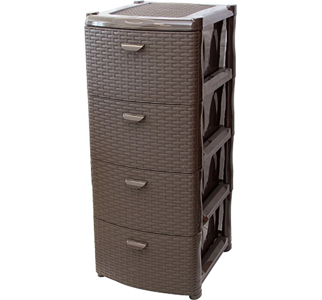 Влагостойкий пластиковый комод с 4 вместительными ящиками органично впишется в интерьер ванной, прихожей или балкона. Универсальный дизайн с текстурой натурального ротанга сочетает практичность и эстетику.