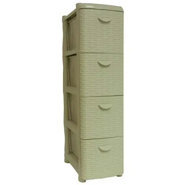 Стильный пластиковый комод с текстурой натурального ротанга станет практичным решением для небольших помещений. 4 вместительных ящика обеспечат порядок в ванной, прихожей или балконе, а компактные габариты позволят разместить его даже в узких промежутках.