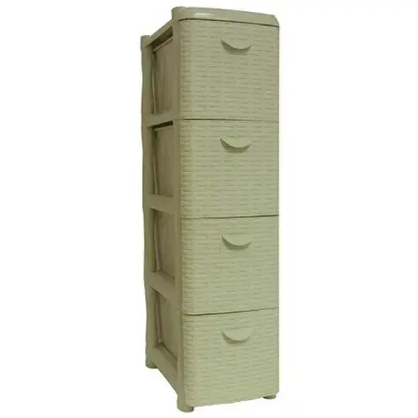 Комод узкий пластиковый с четырьмя вместительными секциями — удобное решение для организации пространства, когда важна каждая деталь. Имитация ротанга на светло-бежевых ящиках не только добавляет уюта, но и гармонично впишется в современный интерьер, создавая атмосферу легкости и порядка.