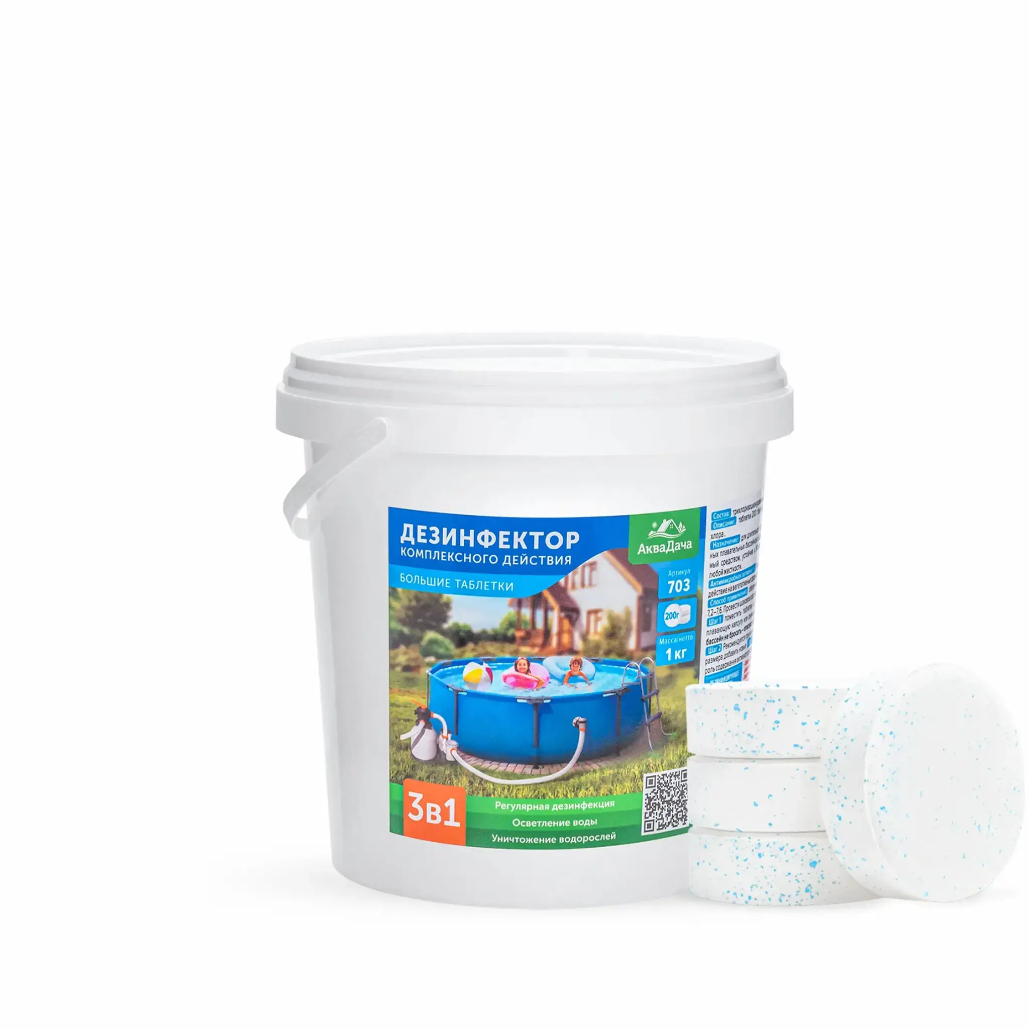 Забудьте о проблемах с загрязненной водой. Средство 'Аквадача DK1TA' обеспечивает комплексную защиту: дезинфекция, очистка и предотвращение появления водорослей.