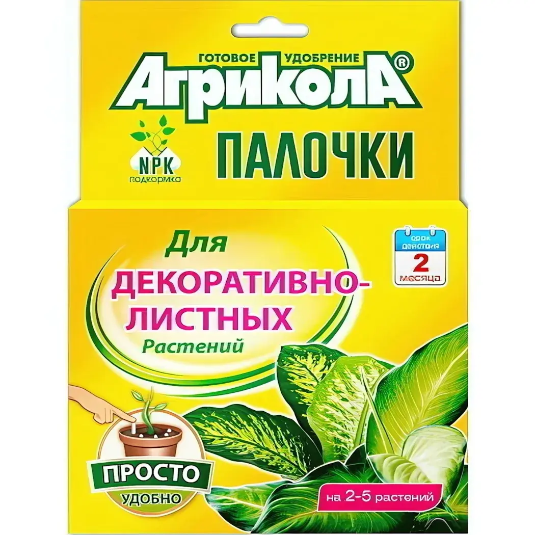 Удобрение подходит для декоративно-листных растений и может использоваться как в домашних условиях, так и на даче. Просто вставьте палочки в грунт, и они начнут медленно выделять необходимые элементы питания, обеспечивая ваши растения всем необходимым на срок до 2 месяцев. Это идеальное решение для занятых людей, которые хотят обеспечить своим растениям качественный уход без лишних усилий.