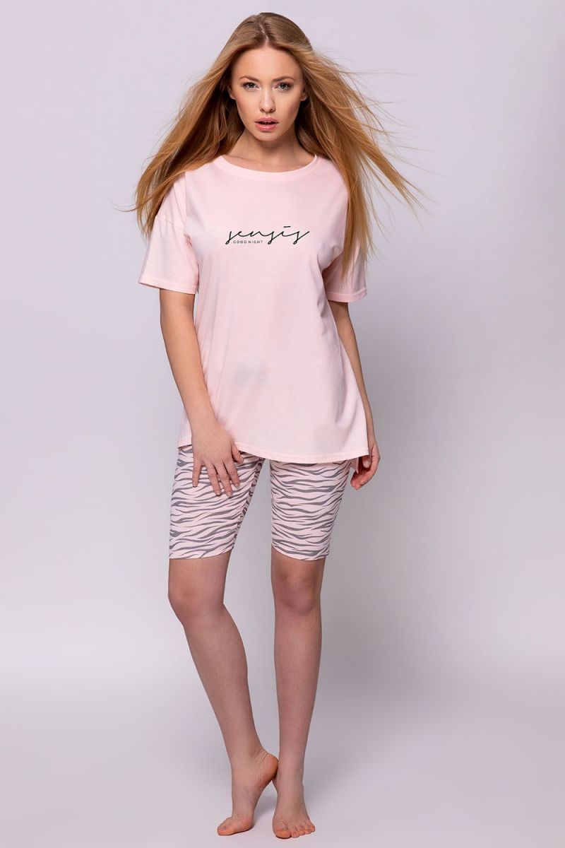 - Стильный дизайн: Сочетание нежного персикового фона с модным принтом в виде тигровой полоски на шортах создаёт современный и яркий образ.