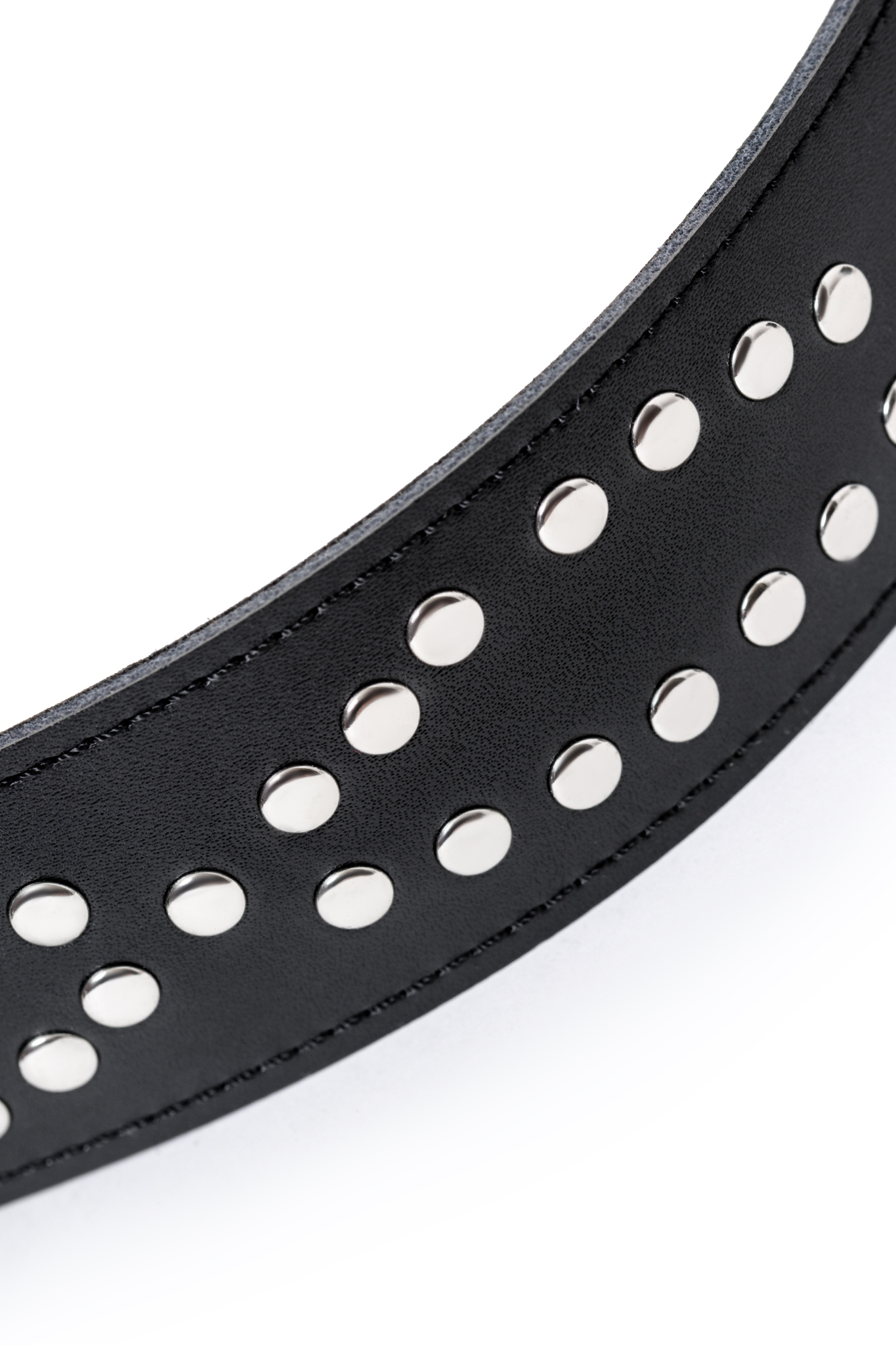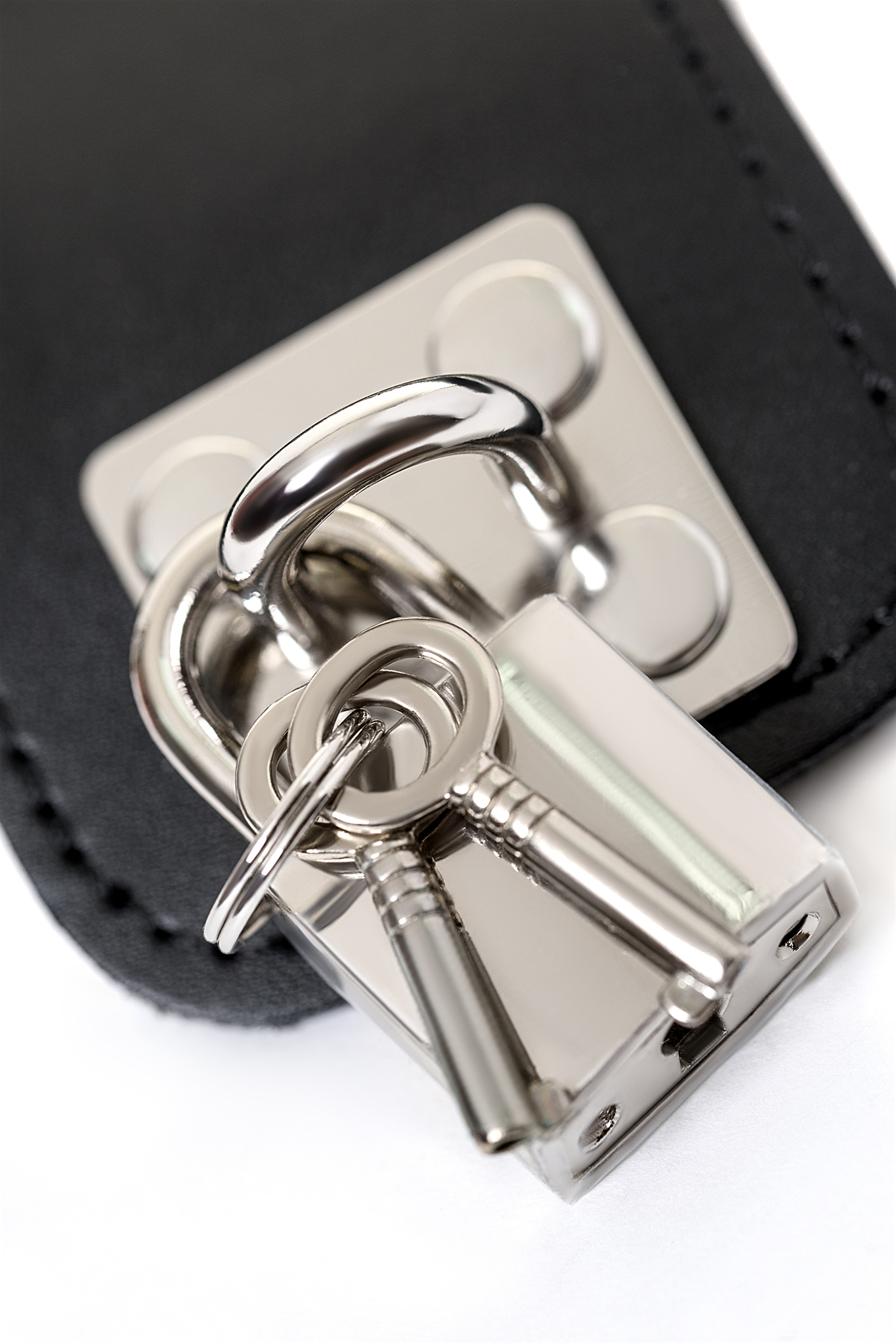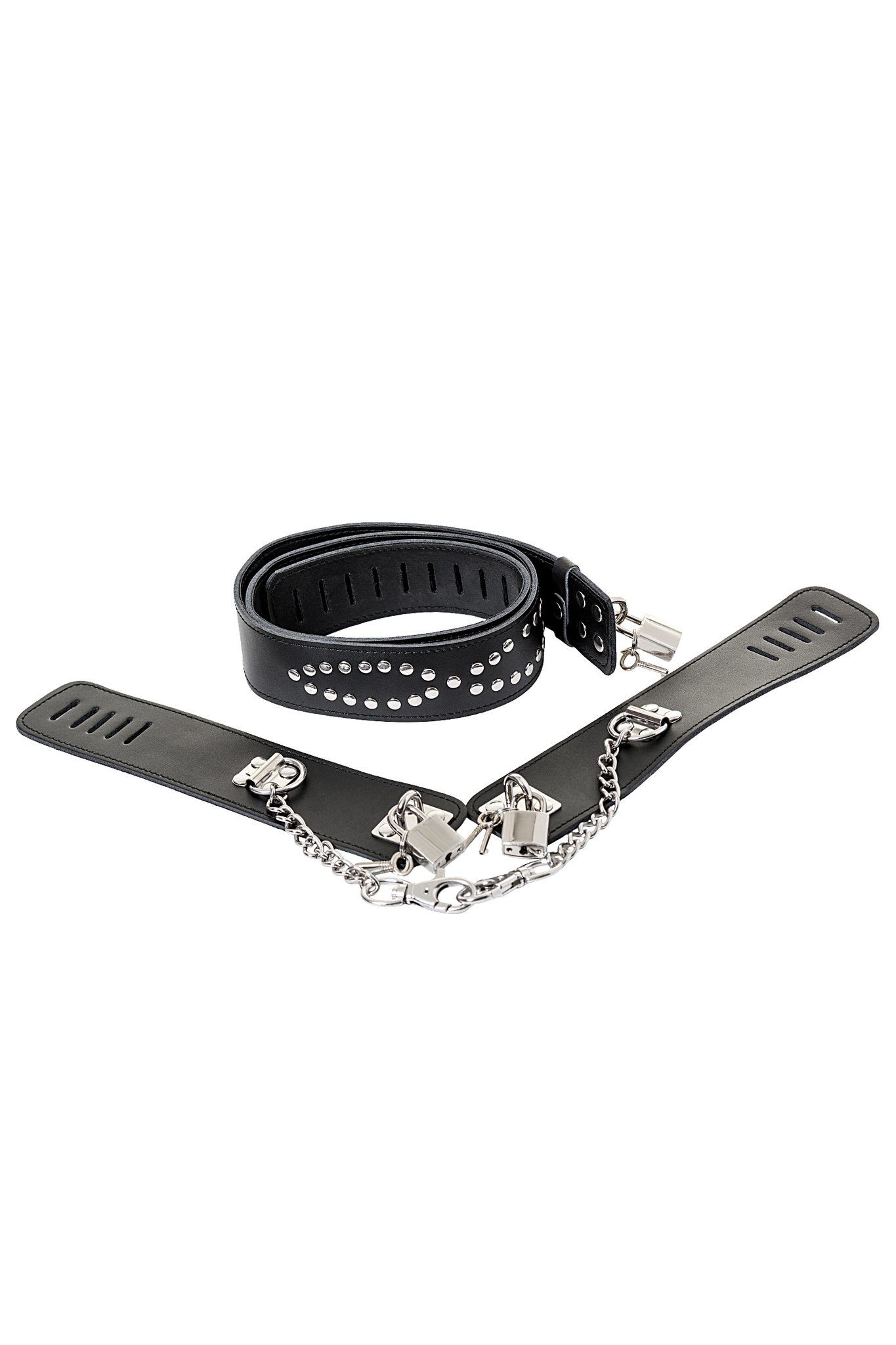 Комплект включает: 1 пояс шириной 5 см с декоративными заклепками, 2 наручника с мягкой внутренней отделкой, 2 цепи длиной 15 см с карабинами. Материал: полированная искусственная кожа черного цвета с серебристой фурнитурой. Уход: протирать сухой салфеткой, избегать контакта с маслами.