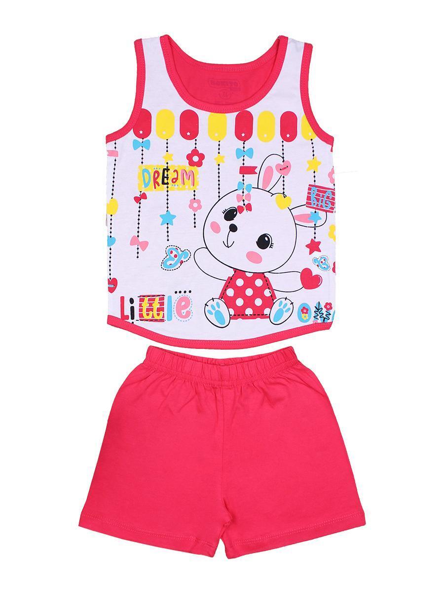 Майка белого цвета с красными кружевами и изображением зайчика "Dream Little". Шорты ярко-розового цвета с эластичным поясом, обеспечивающим комфортную посадку. Размер 98.