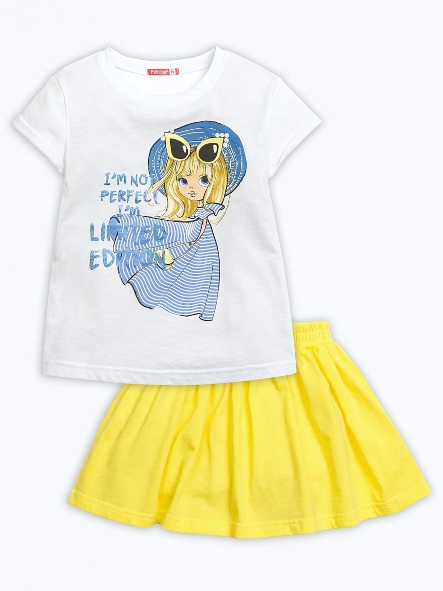 Комплект одежды для девочек: футболка с принтом + юбка, размер 110, белый/жёлтый