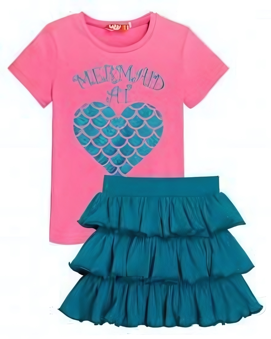 Позвольте малыше погрузиться в мир сказочных приключений: мягкая футболка с принтом «русалка» и яркой бирюзовой сердцевиной, сочетаясь с воздушной юбкой‑рюшкой, создаёт лёгкий летний образ, который будет радовать как ребёнка, так и родителей.