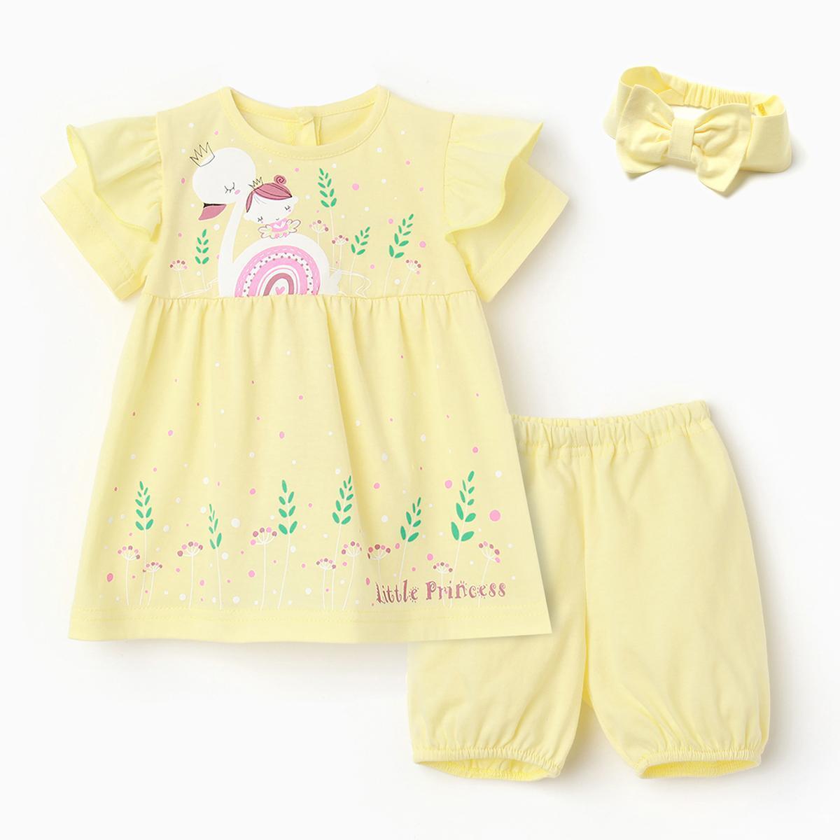 Подарите своей девочке яркое настроение и комфорт в светло-желтом комплекте, где каждый элемент продуман до мелочей: мягкое платье с рюшами и милым принтом, удобные трусики и изящная повязка с бантом.