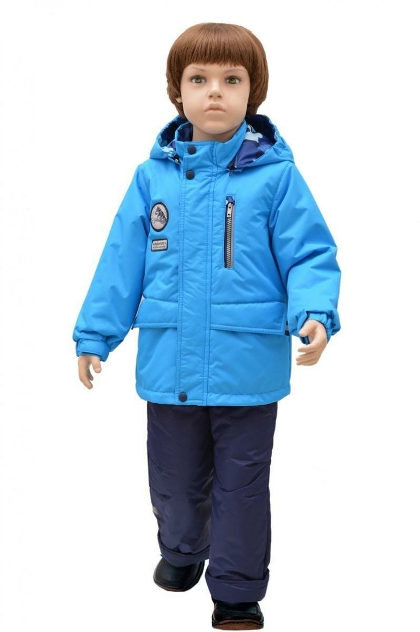 Комплект состоит из ярко-голубой куртки с капюшоном и тёмно-синих утеплённых штанов. Куртка оснащена застёжкой на молнию с защитной планкой на кнопках, вертикальным нагрудным карманом на молнии и удобными боковыми карманами для мелочей. Шевроны придают изделию стильный вид, а капюшон защищает голову от ветра и осадков.