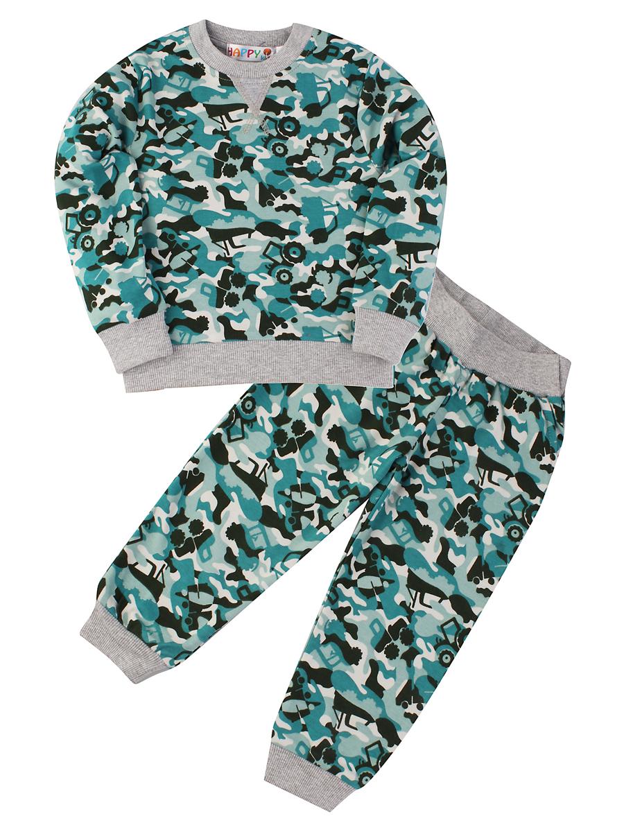 - Камуфляжный принт в сине-зелёной гамме с тематическими рисунками машин и животных