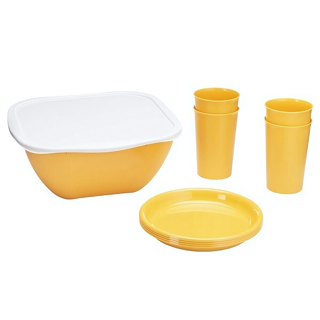 Этот набор посуды идеально подходит для пикников, барбекю и выездов на природу. В него входят 4 плоских тарелки, 4 стакана объемом 400 мл, а также квадратный салатник на 4,5 литра с крышкой. Стаканы подходят как для горячих, так и для холодных напитков, что делает их универсальными для любого случая.