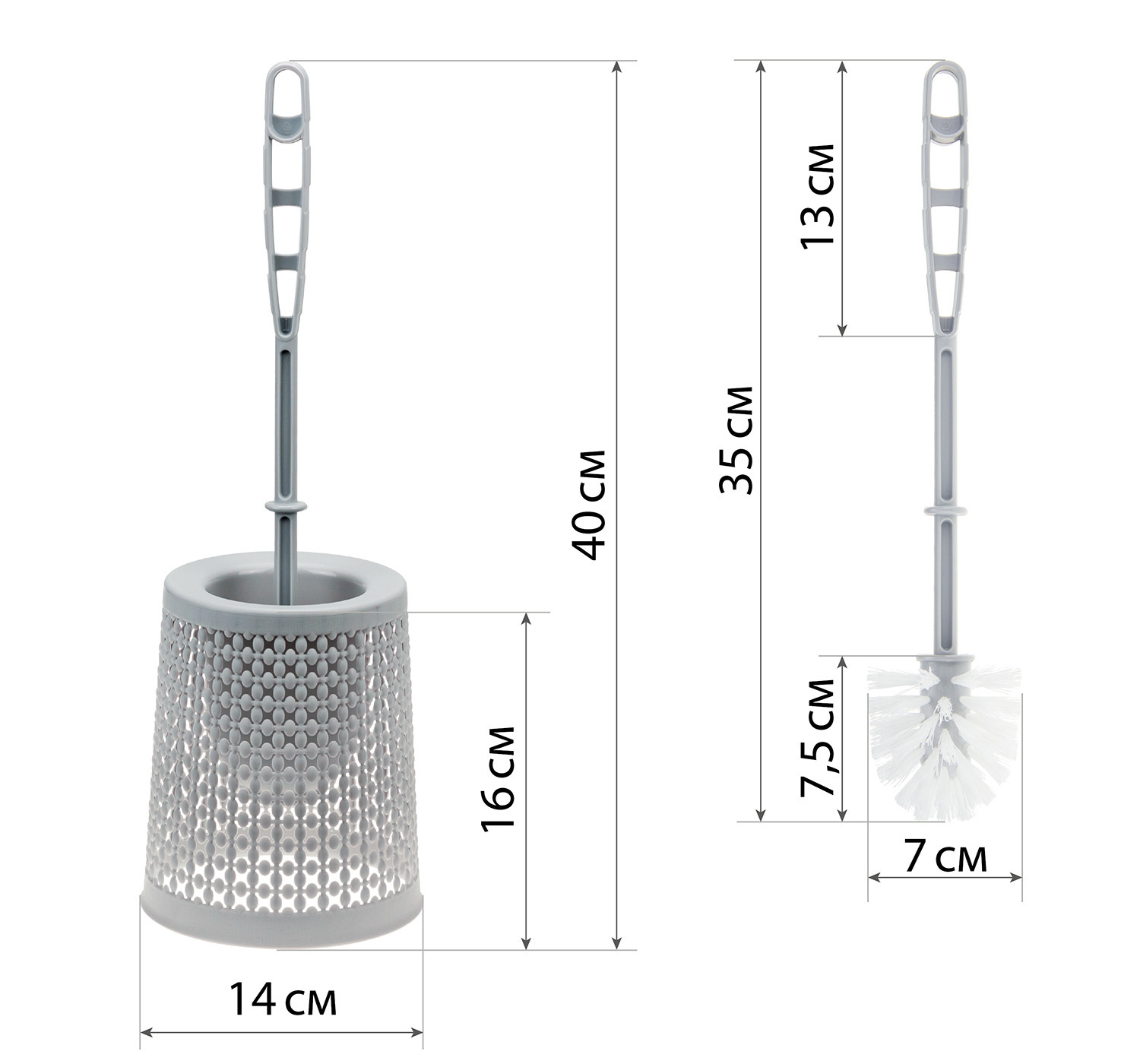 Ерш туалетный идеально подходит для поддержания чистоты в вашем туалете. Он оснащен удобной ручкой длиной 35 см, что обеспечивает легкость в использовании. Длина щетки составляет 7,5 см, а ее диаметр — 7 см, что позволяет эффективно очищать унитаз. Подставка имеет конусообразную форму с перфорацией, высота 16 см и диаметр 14 см, что делает ее компактной и удобной для хранения.