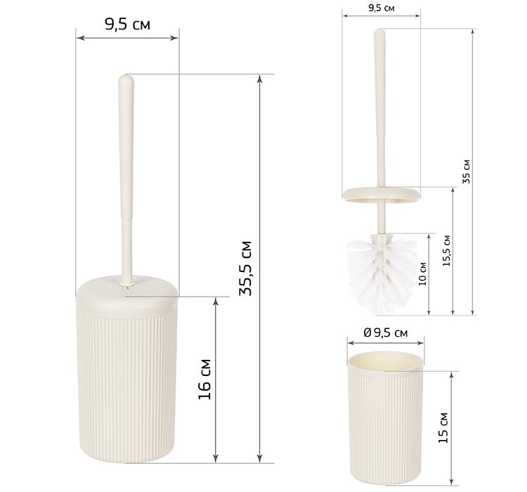 Диаметр подставки — 9,5 см, высота — 16 см. Длина рабочей части щетины — 10 см, общая длина ерша — 35,5 см. Изготовлен из ударопрочного пластика, легко моется и не теряет цвет со временем.
