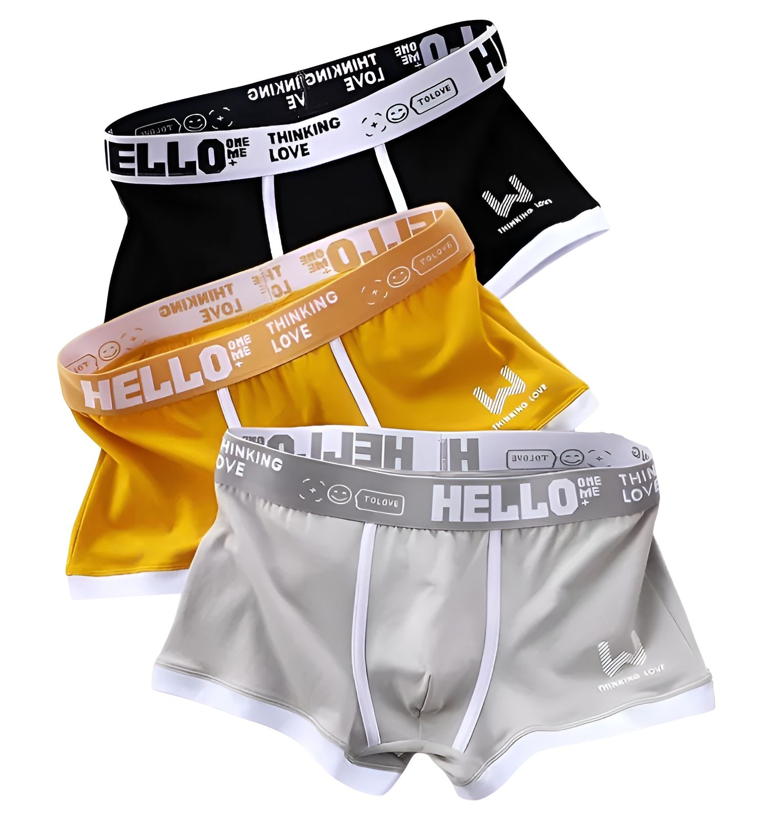 - Стильный дизайн: Каждая пара имеет уникальный цвет (черный, желтый, серый) с контрастной белой окантовкой и модным принтом с надписью «HELLO» на широкой резинке.