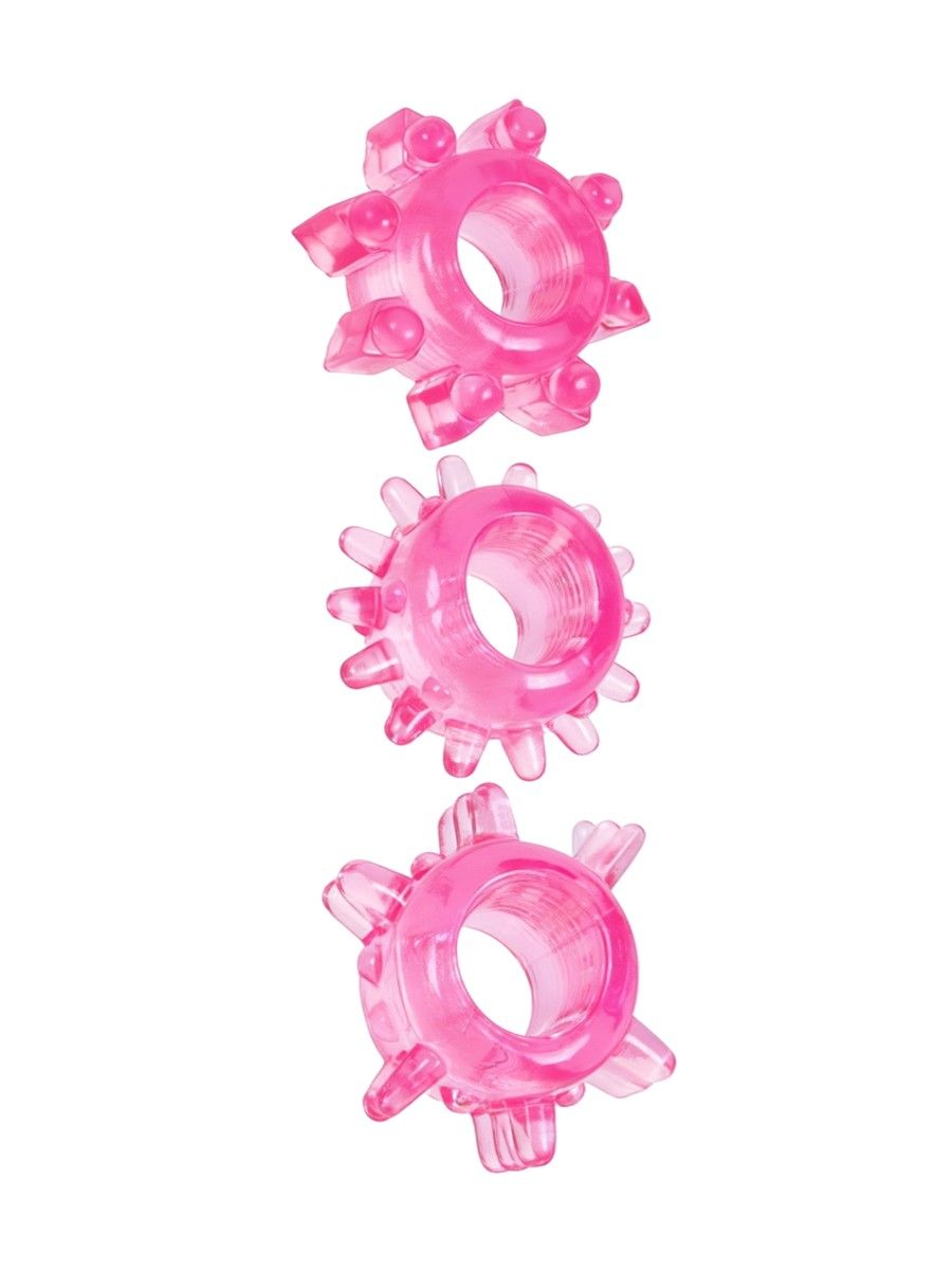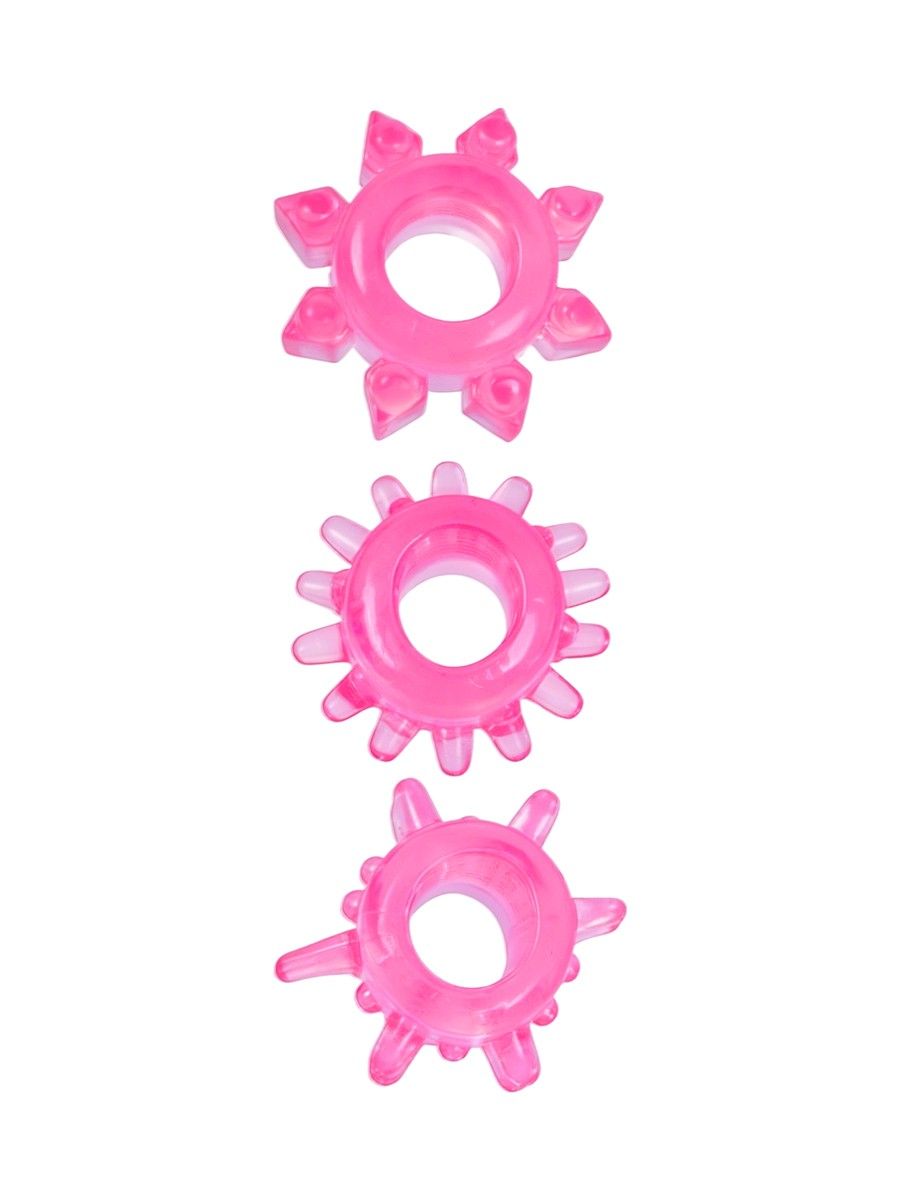 Изделия выполнены из термопластичной резины (TPR), которая отличается мягкостью и упругостью. Материал хорошо тянется и комфортно ощущается на коже. Цвет — розовый. В комплекте 3 эрекционных кольца с различным рельефом поверхности, без вибрации. После использования рекомендуется промыть тёплой водой с мягким средством и тщательно высушить.