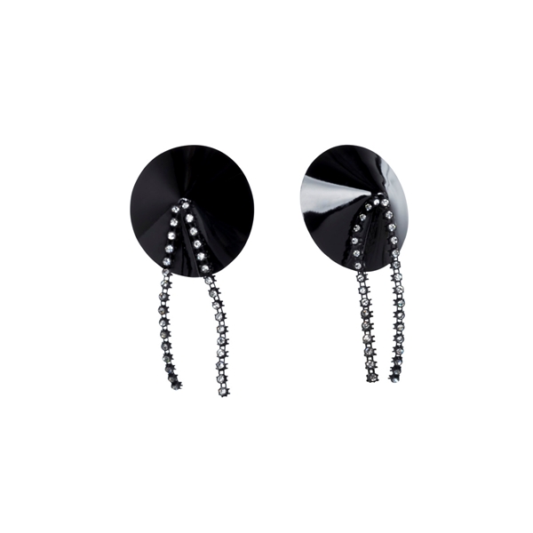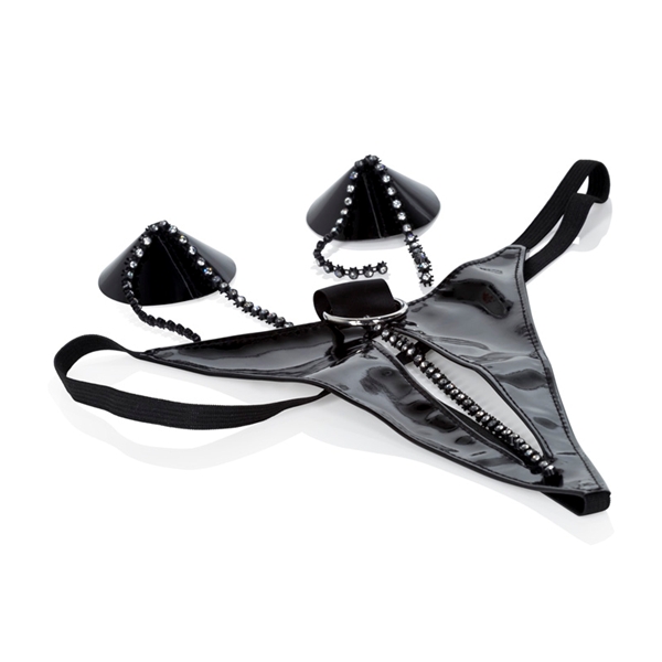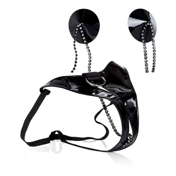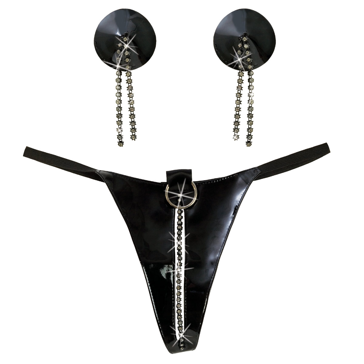 Комплект эротический «Bound by Diamonds»: трусики-стринги и накладки, черный глянец, металлические детали