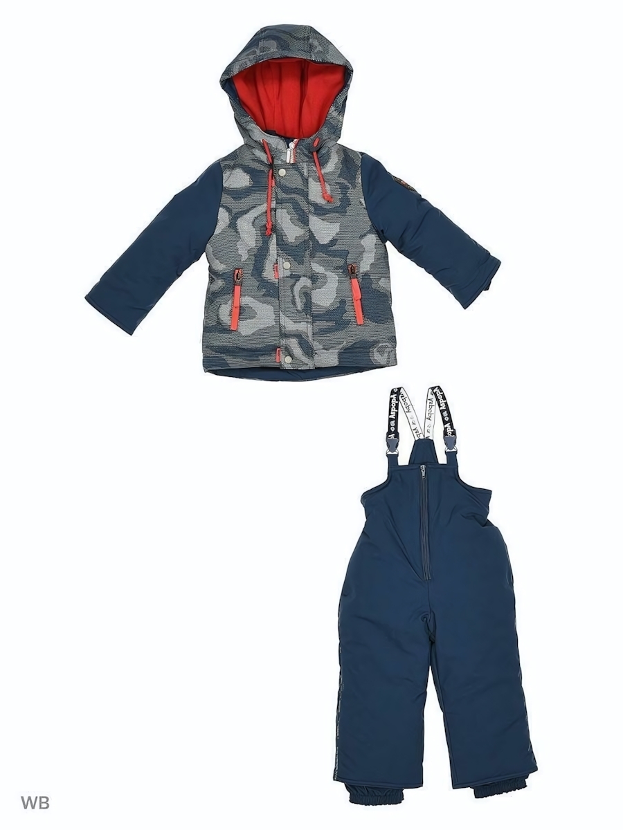 Комплект состоит из тёплой куртки с капюшоном и полукомбинезона. Куртка оснащена утягивающим шнурком на капюшоне, молнией с защитной планкой на кнопках и двумя удобными карманами на молнии. Полукомбинезон однотонного тёмно-синего цвета с регулируемыми лямками и центральной молнией, что облегчает одевание.