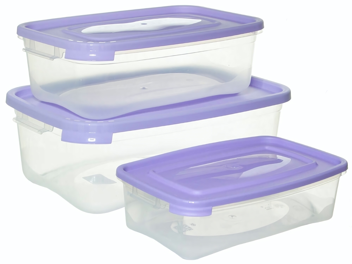 Светло-фиолетовые крышки с удобными защелками обеспечивают герметичность. Прозрачные стенки позволяют легко видеть содержимое. Контейнеры имеют прямоугольную форму с закругленными углами, что делает их удобными для хранения и использования.
