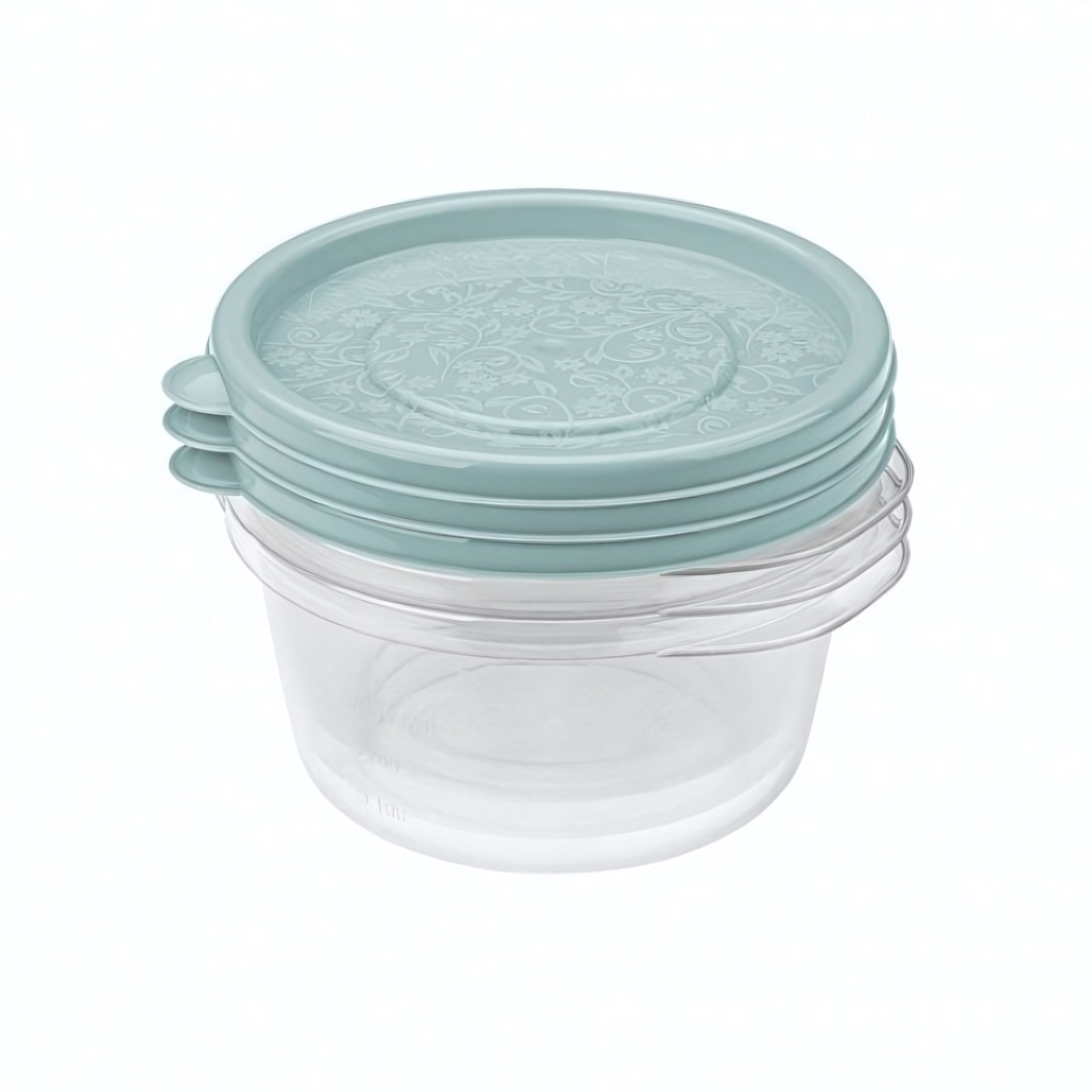 Прозрачные контейнеры со светло-голубыми крышками и цветочным декором сочетают практичность с элегантным дизайном. Идеальны для организации пространства, заморозки продуктов и разогрева в микроволновке.