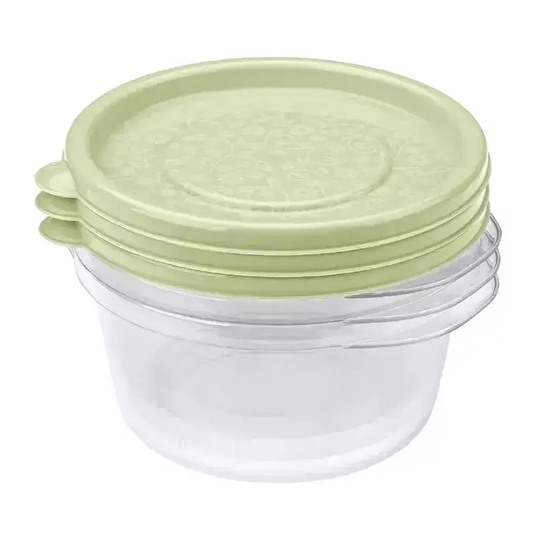 Одинаковый объём 0.44 л позволяет компактно размещать контейнеры друг на друге. Зелёные крышки создают цветовую маркировку для разных категорий продуктов. Удобная глубина ёмкостей подходит для нарезки овощей и хранения соусов.