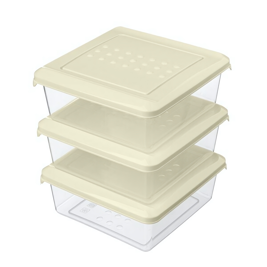Благодаря оригинальной текстуре с пузырьковым узором, контейнеры обеспечивают надежный захват, не скользят в руке и устойчиво складываются друг на друга, что экономит место в холодильнике и на кухне. Плотные крышки с отверстиями позволяют легко открывать и закрывать, сохраняя свежесть содержимого.