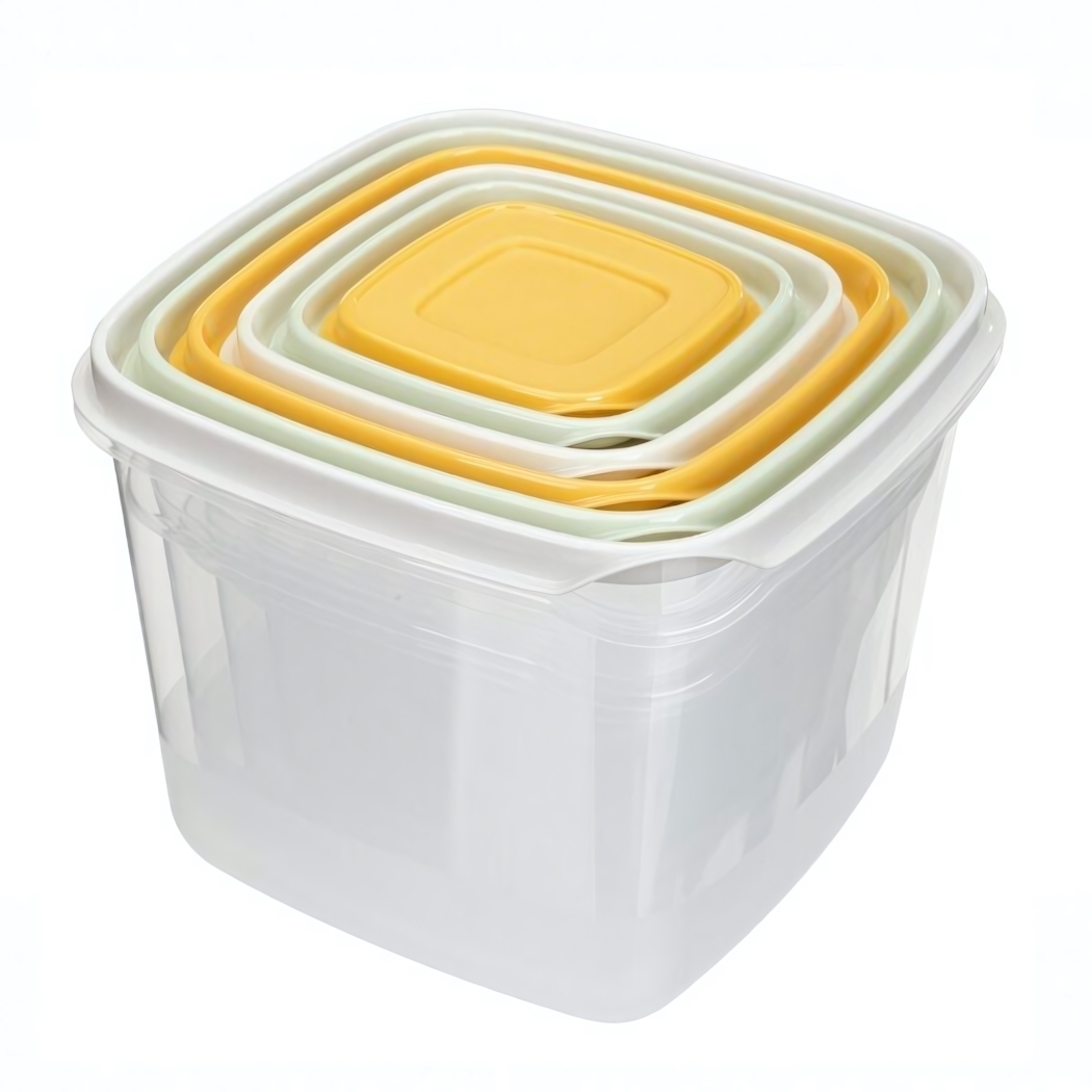Контейнеры имеют квадратную форму и выполнены из прозрачного пластика, что позволяет видеть содержимое. Цвета крышек — желтый, светло-зеленый и белый, что добавляет яркости и стиля на вашу кухню. Размеры контейнеров варьируются от 0,12л до 2,0л, что делает их идеальными для любых нужд.