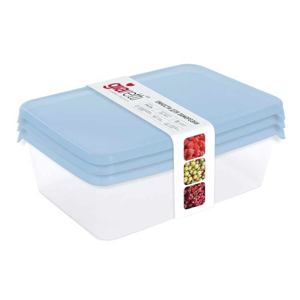 Тонкий, но прочный пластик выдерживает температуры от -30°C до +70°C. В комплект входит 3 контейнера объемом 0,9 литра каждый с надежными голубыми крышками. Удобная конструкция позволяет экономить место в морозильной камере благодаря хорошей укладке друг на друга.