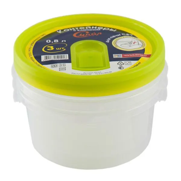 - Компактное хранение: Круглая форма и одинаковый размер позволяют компактно складывать контейнеры друг в друга, экономя место в шкафу или холодильнике.