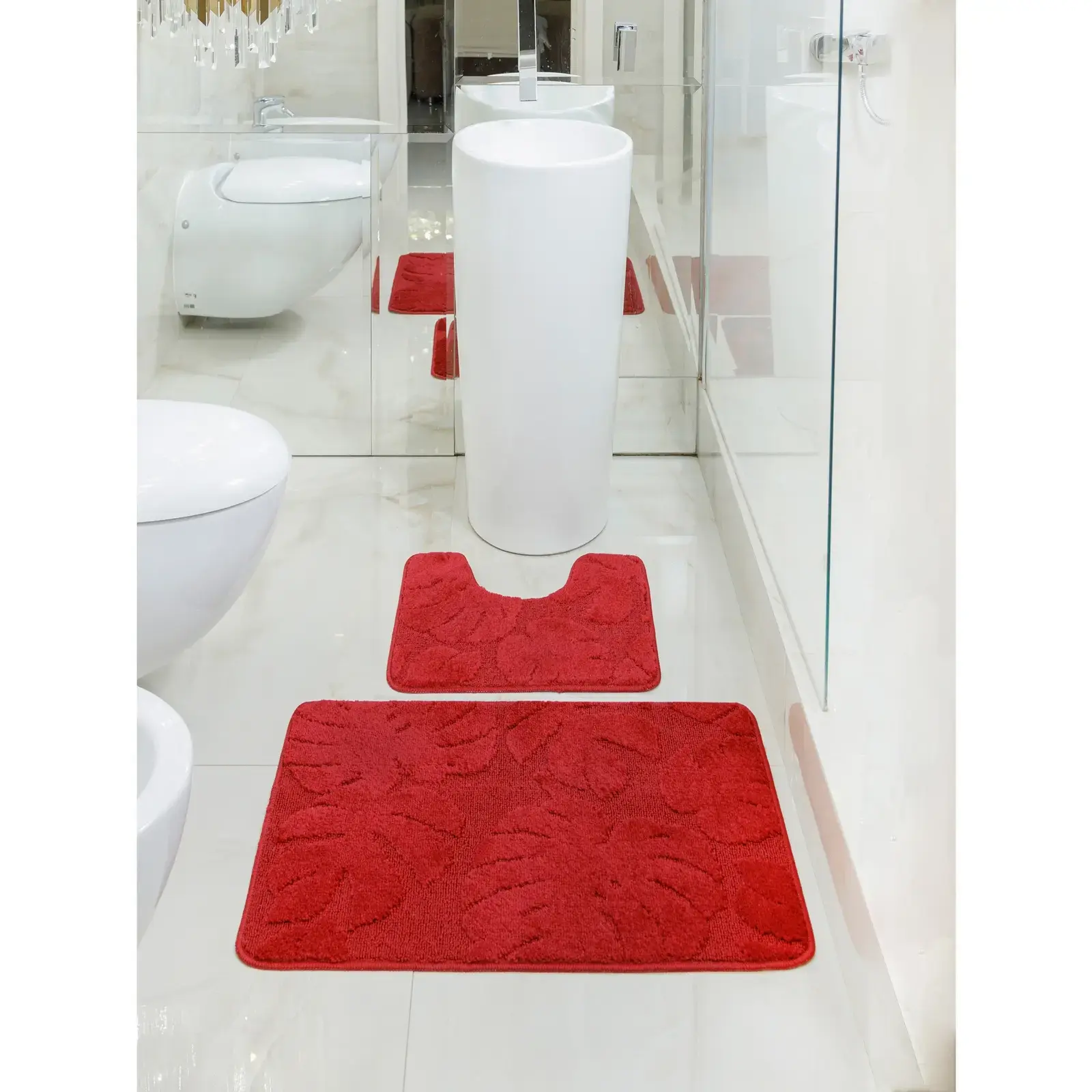 Набор из двух ковриков серии «Gold» создан, чтобы сделать ваше утро приятнее, а интерьер — стильнее. Мягкий ворс, рельефный узор в виде листьев и насыщенный бордовый цвет превратят обычную гигиеническую зону в уютное пространство.