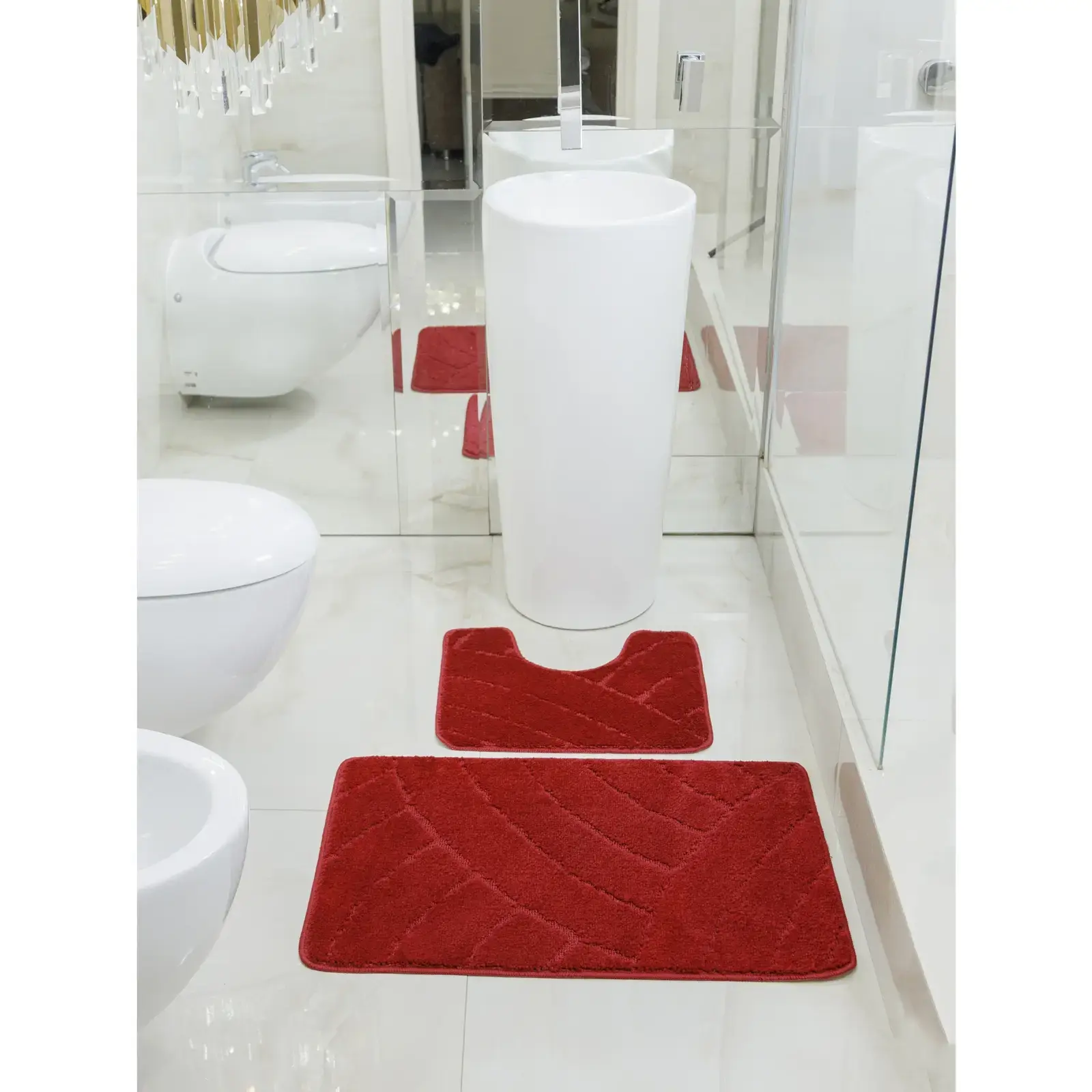Обновите интерьер вашей ванной с комплектом ковриков 'My Crystal Gold'. Эти противоскользящие коврики не только создают безопасную зону на мокром полу, но и подчеркивают элегантность помещения своим благородным бордовым оттенком.