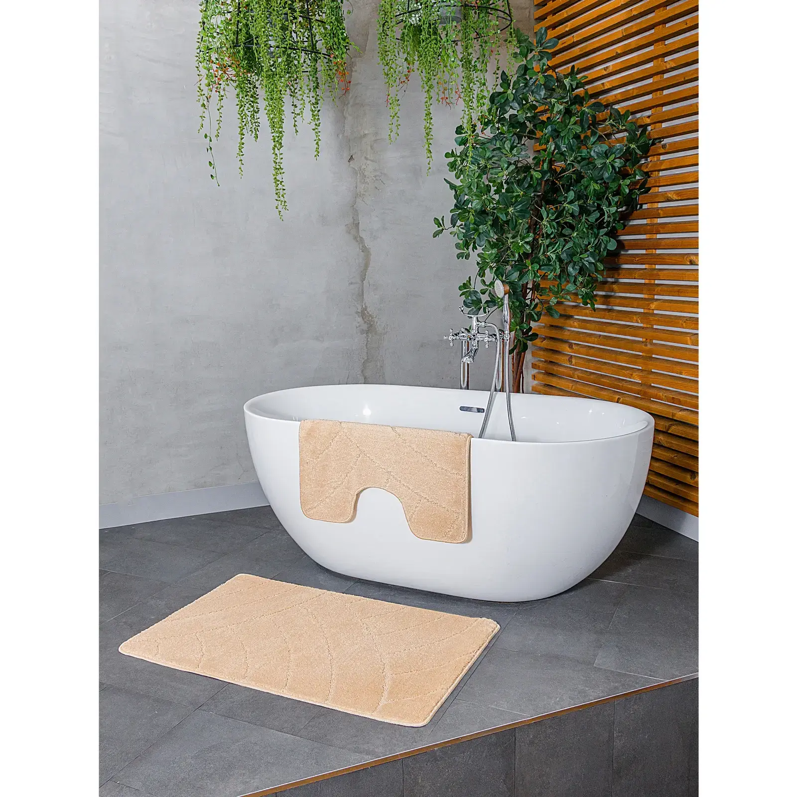 Светло-бежевый оттенок гармонично впишется в любую цветовую гамму, а текстурированная поверхность добавит интерьеру современный акцент. Набор из двух ковриков оптимален для зонирования пространства: разместите прямоугольную модель у ванны, а анатомическую — возле унитаса.