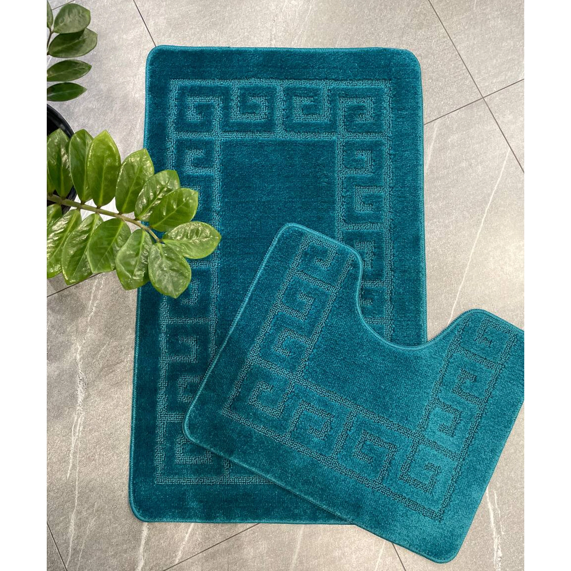 - Эстетичное дополнение: Насыщенный изумрудный цвет и рельефный геометрический узор по периметру каждого коврика добавляют интерьеру стильный акцент, гармонируя с современной сантехникой и отделкой.