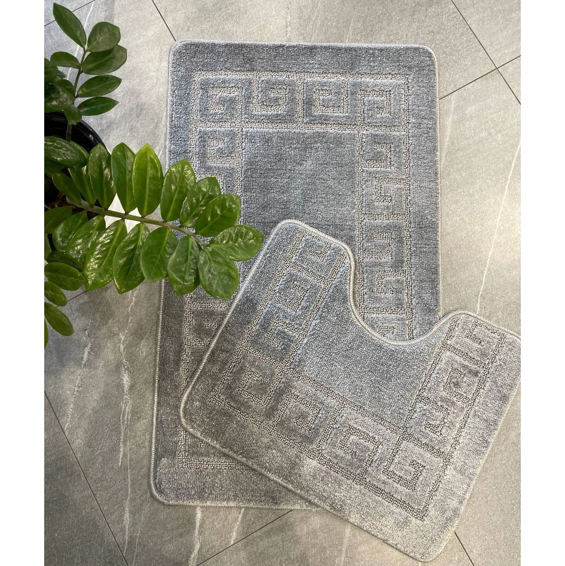 - Эстетика: Классический серый цвет и геометрический орнамент по периметру каждого коврика гармонично впишутся в современный или классический интерьер ванной комнаты, создавая целостный и продуманный образ.