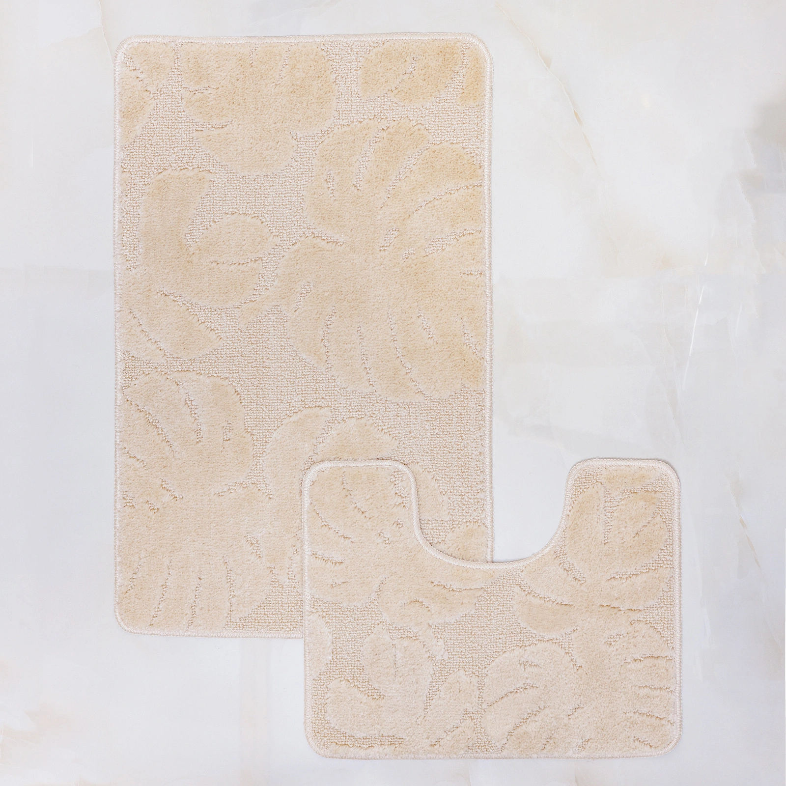 Коврики выполнены в едином стиле с рельефным рисунком в виде крупных листьев тропического растения монстера. Сочетание приподнятого и низкого ворса создает объемный эффект и приятную тактильную поверхность. Светлая окантовка по периметру подчеркивает аккуратный внешний вид и завершает дизайн. Бежевый цвет гармонично сочетается с большинством популярных отделочных материалов для санузлов.